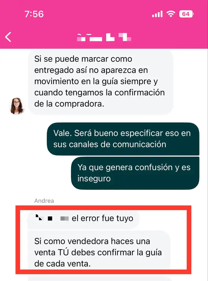Como puedes ver en la conversación, el cliente sugiere que la empresa sea más clara o amplíe la información en X caso; sin embargo, recalcan su equivocación y utilizan mayúsculas para reiterarlo (además de la falta de puntuación). Se leería mejor si fuera: "Gracias, lo tendremos en cuenta para que no le suceda a otras personas. Por ahora te cuento que aunque el proceso no se haya realizado correctamente, te podemos ayudar de la siguiente manera… Ahora ya lo sabes para una próxima oportunidad".