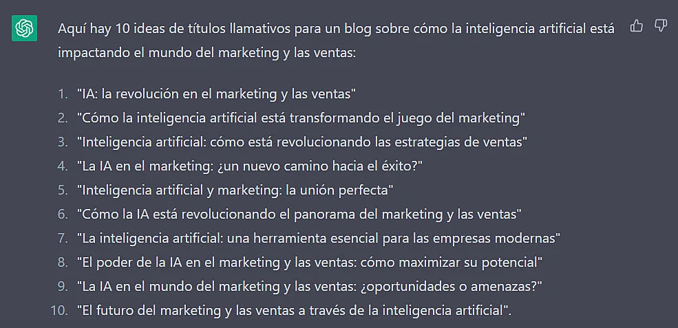 Digamos que necesitas escribir un blog sobre el impacto de la inteligencia artificial en el marketing y las ventas, pero necesitas ideas de un título atractivo. Preguntemos a ChatGTP que nos haga 10 títulos atractivos. Este es el resultado: