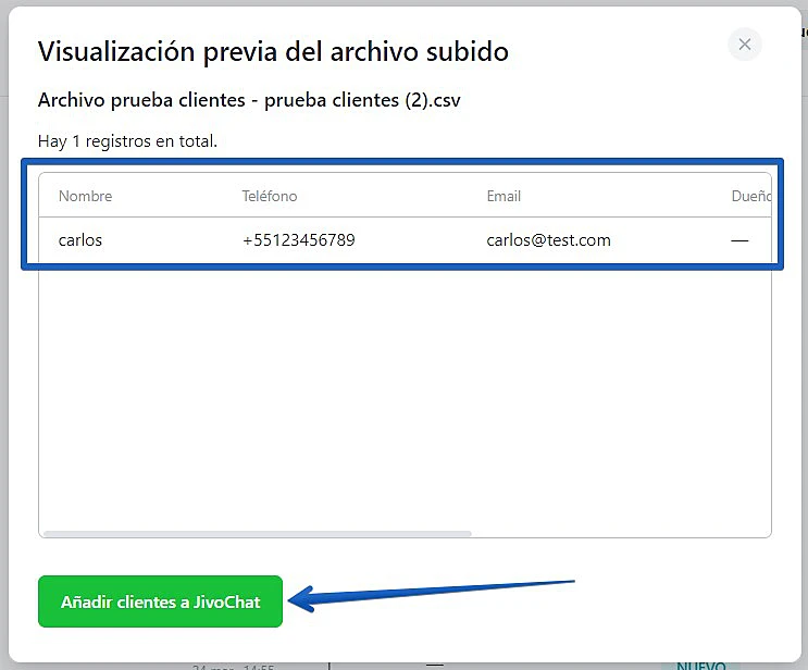 En caso de que todo salga bien, verá la lista de clientes. Verifique que los datos son correctos y haga clic en el botón de "Cargar clientes a JivoChat"