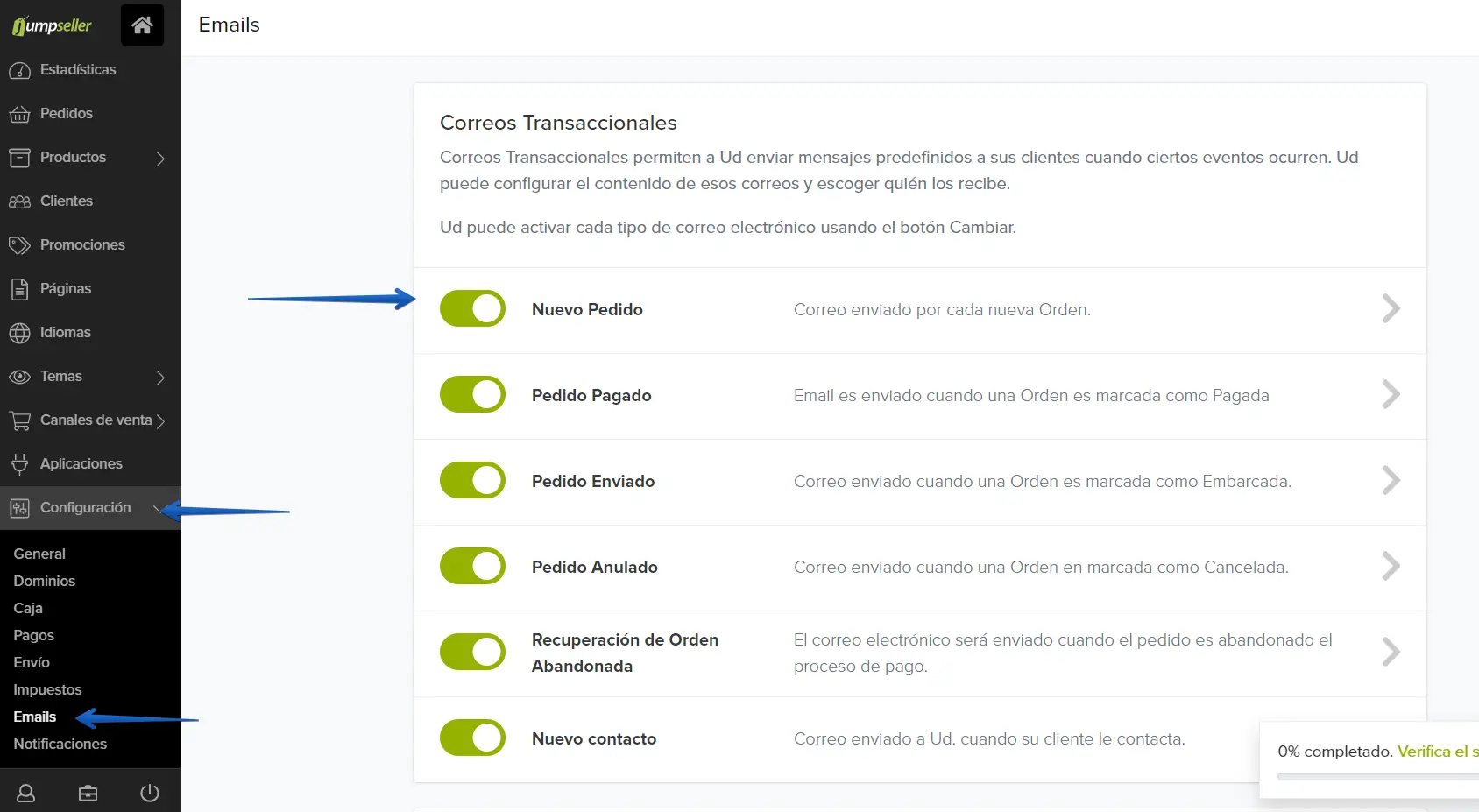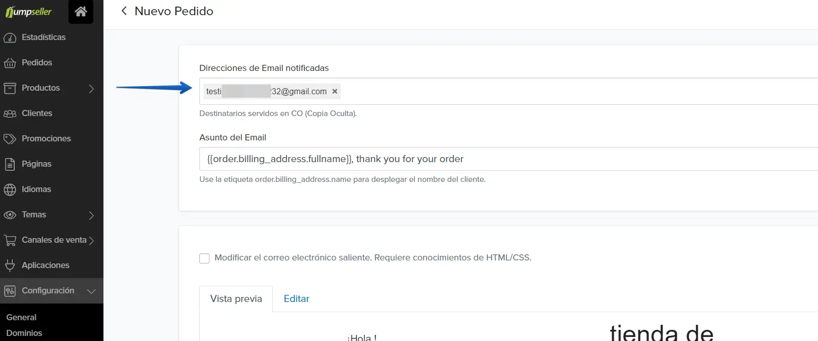 5. Ingrese a tu panel de JumpSeller, vaya a la "Configuración"-> "Emails"-> y luego en "Nuevo pedido"