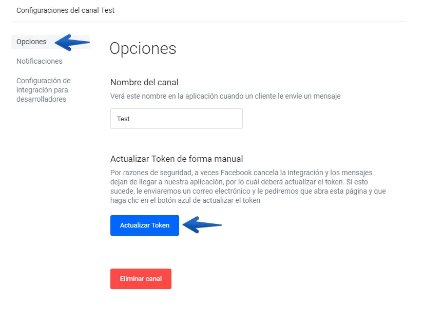 En caso de que haya recibido un correo electrónico en dónde le pedimos que actualice el token de Facebook o no reciba los mensajes de sus página y llegue algún código de error, siga estos pasos para actualizar el token y recuperar el funcionamiento de la integración Si tiene varias páginas integradas, deberá hacer el mismo procedimiento con cada una