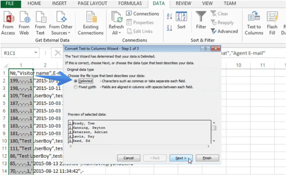 6.Seleccionar la opción "Delimitado" en la primera etapa de la "Convertir texto en columnas Asistente" y pulse "Siguiente".