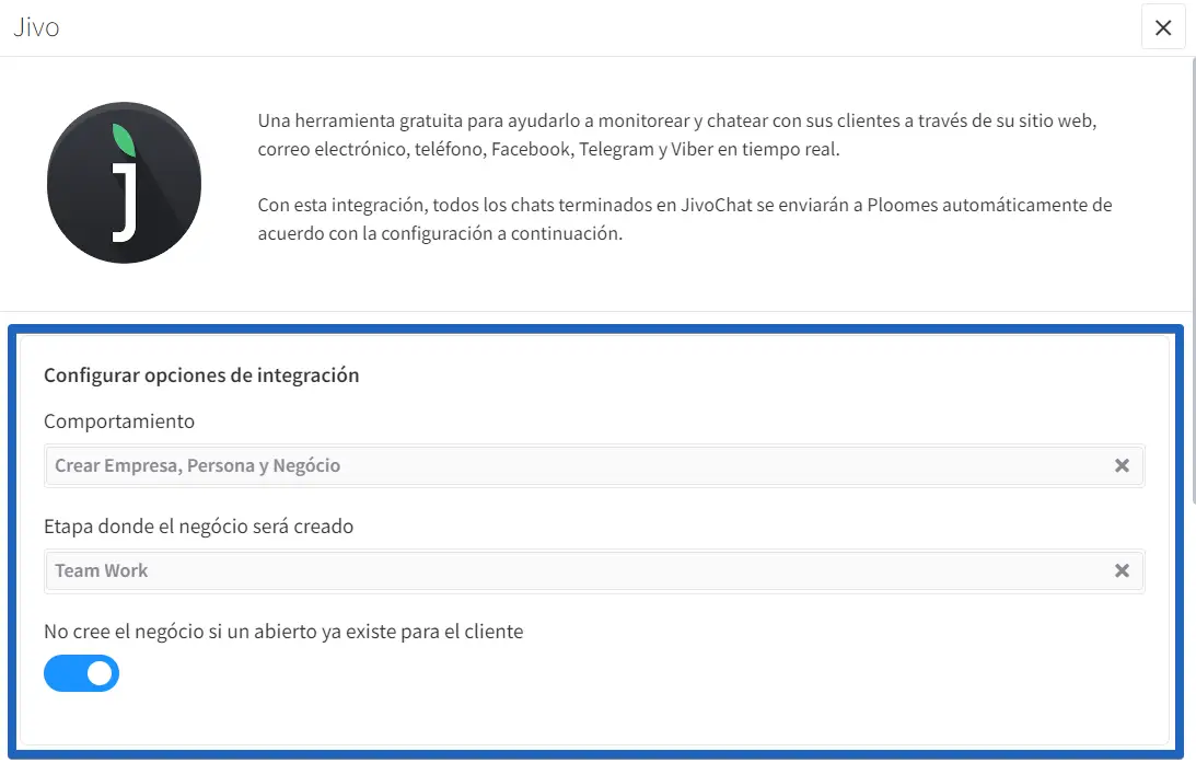 ¡Listo! ¡La integración está completa! Ahora, cada vez que se cierre una conversación en JivoChat, el comportamiento elegido se manifestará en Ploomes.