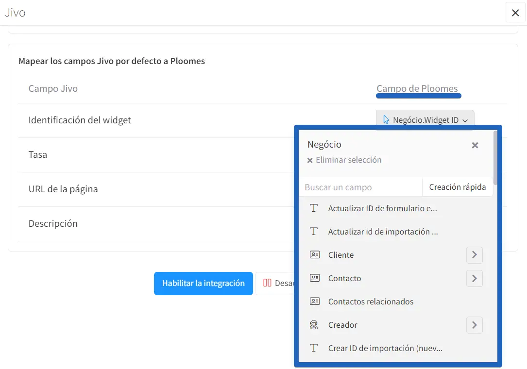 - También puede mapear campos estándar de JivoChat con campos de Ploomes, como se muestra en el ejemplo a continuación: