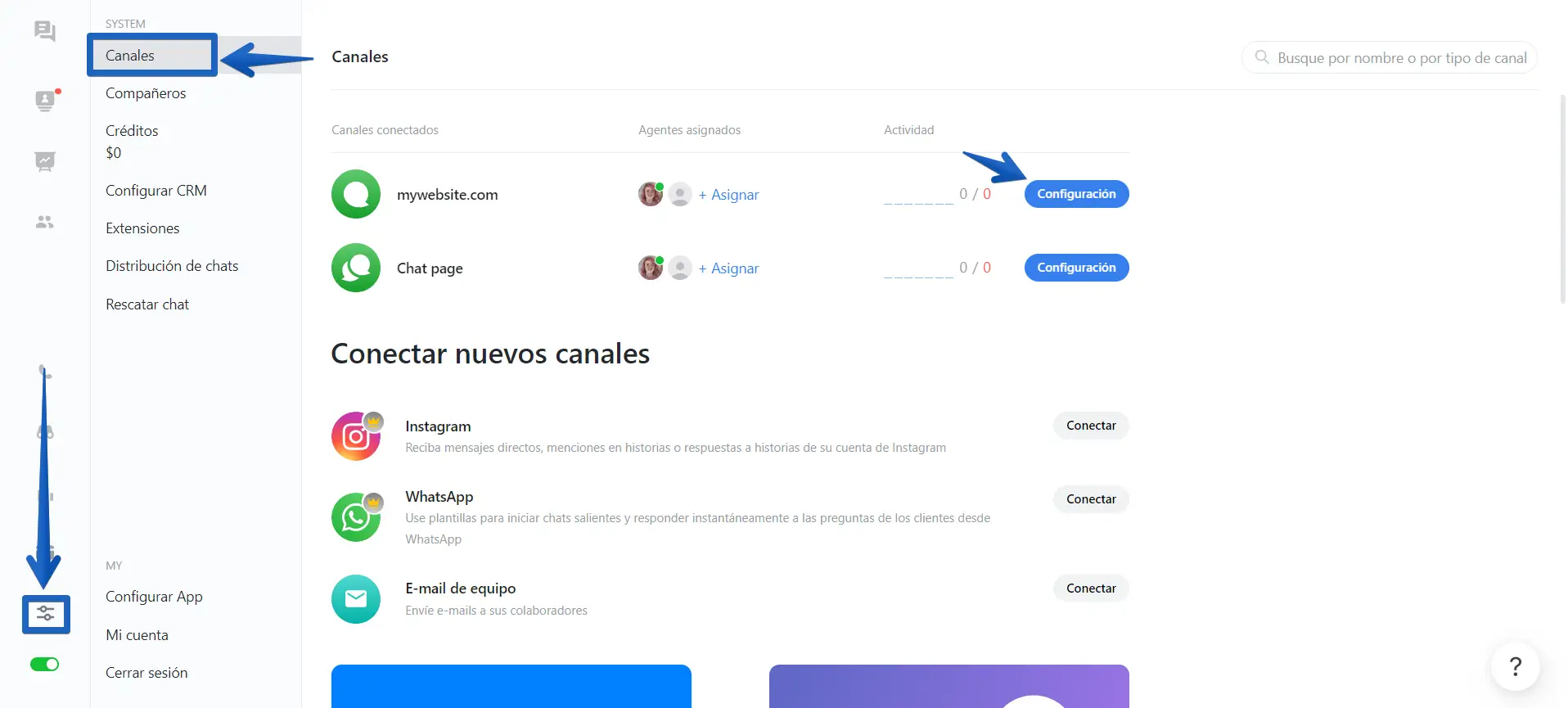 - Acceda a su aplicación web de JivoChat o cualquiera de nuestras aplicaciones de escritorio, y haga clic en Ajustes -> Canales -> Configuración para el canal deseado.