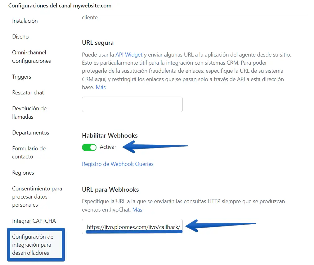 - En el menú de la izquierda, haga clic en "Configuración de Integración para Desarrolladores", active la opción "Habilitar Webhooks" y pegue la URL generada en el campo "URL para Webhooks".
