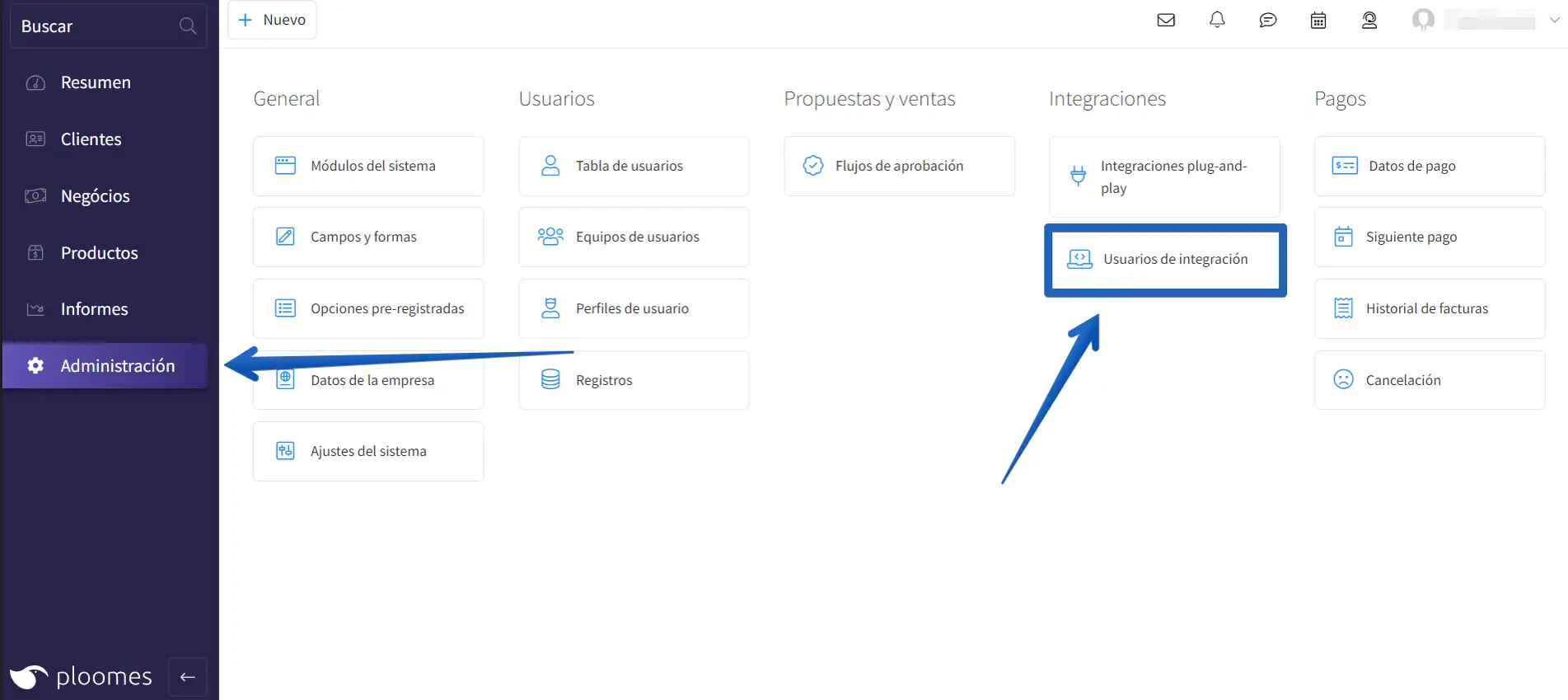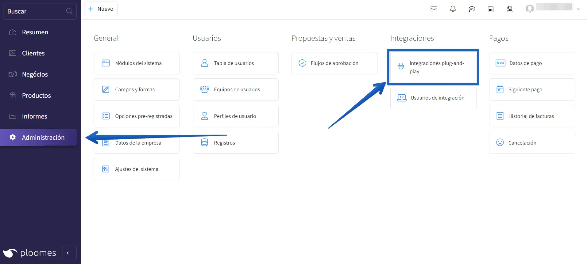- Acceda a la sección de Administración en su aplicación de Ploomes y haga clic en Integraciones Plug-and-Play: