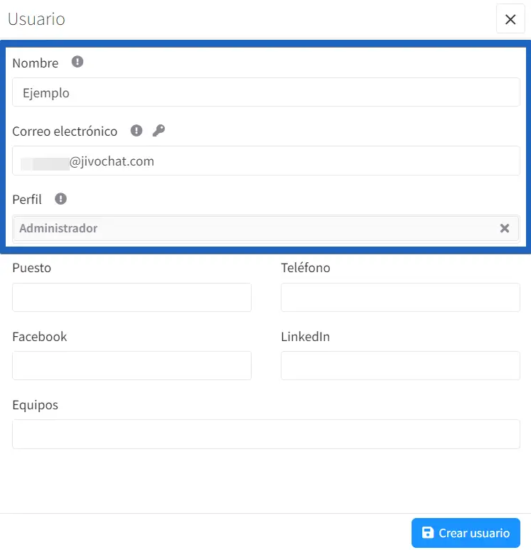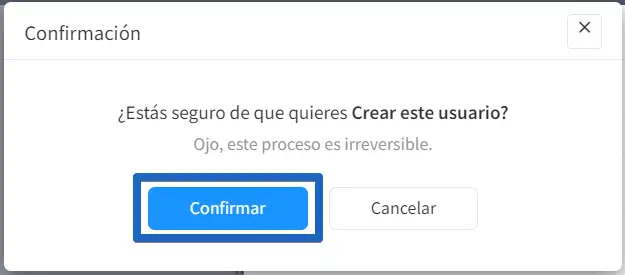 Ingrese un nombre, correo electrónico y seleccione un perfil de usuario (le recomendamos seleccionar la opción de Administrador). Luego de eso, haga clic en "Crear usuario" y confirme la creación del mismo.