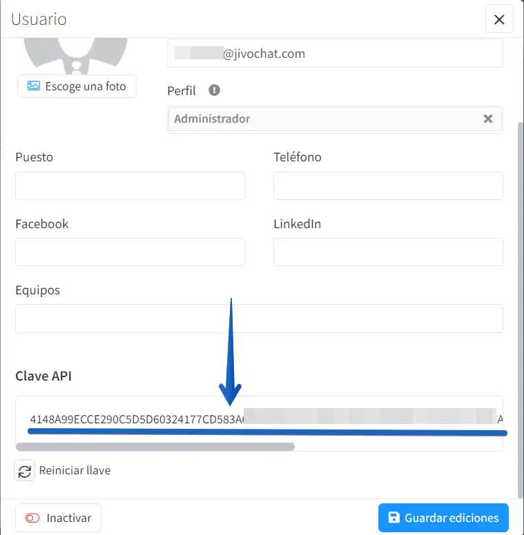 Copie la llave API de las configuraciones del nuevo usuario y peguelas en el campo "Token de Acceso" en el campo vacio de la Aplicación de JivoChat.