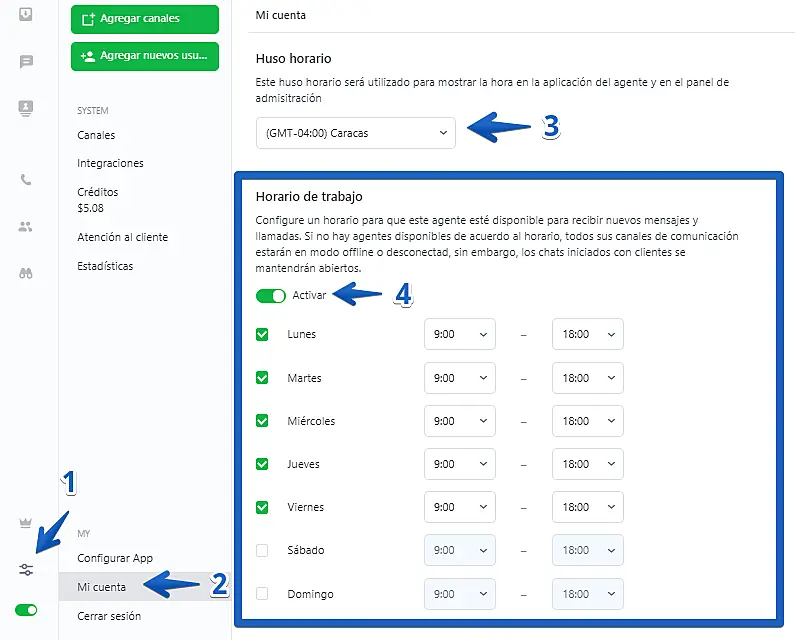 Si usted es administrador y quiere configurar el horario de trabajo para sus agentes solo haga clic aquí para acceder a las configuraciones de sus agentes y configurar el horario de trabajo.
