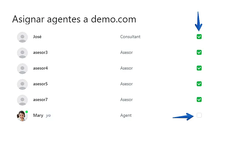 En este menú podrá seleccionar o desmarcar a los agentes para que estén asignados o no asignados al canal.