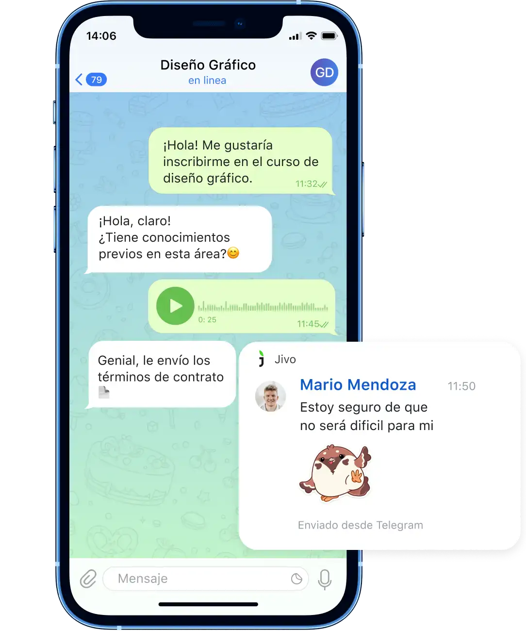 Telegram ha superado los 700 millones de usuarios activos en 2022. El número de descargas de Telegram en el mundo sobrepasa 1 billón. Conecte Telegram a JivoChat para estar más cerca de estos usuarios. Procese requerimientos y supervise la calidad de su servicio al cliente